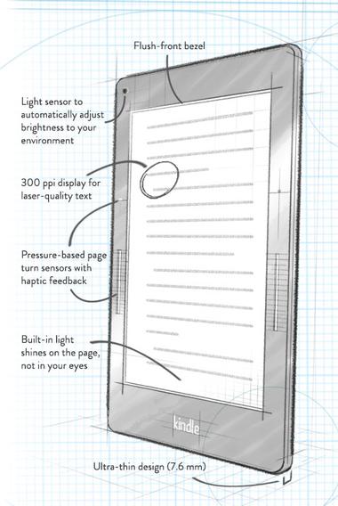Does having a flush surface add another layer over the screen? That would be bad for sharpness and brightness. If it's somehow part of the light-guide or capacity layer, then I guess it's ok. This image made it look like the actual screen is sunk in, which is bad: But on the actual device, it doesn't appear so (unless this is a 'simulated' image): But my biggest worry is that a flush screen is easier to scratch. For example, when you're sliding the device in and out of a bag or pocket, the whole surface gets rubbed on. This is not the case if the screen is sunk in or if the device has a protective case wrap to add a thick lip around the edges. I don't know what kind of glass is on the device, but I hope it's gorilla glass like on the Kindle Fire (if you can believe wikipedia). Oh just get a cover you may say. When I got my K3, I also got the amazon leather lighted-cover for it. One day I tried it without the cover and it felt like it was now half the weight and much more enjoyable to hold. I suspect it will be the same with the Voyage + cover. Lets see: Kindle 3 (8.5oz) + Kindle lighted leather cover (8oz) = 16.5oz Kindle Voyage (6.6oz) + Amazon Leather Origami Cover (4.8oz) = 11.4oz So the Voyage + Cover is 2.9oz heavier than the naked K3 but about 5oz lighter than the K3+cover. Decisions... I wonder why the new cover, which has no built-in light, still costs the same as previous covers that do include a light. I wonder if they will make a cover similar to ipad covers where it only covers the screen and not the back so it can be half the weight. Last edited by badbob001; 10-14-2014 at 06:17 PM. |