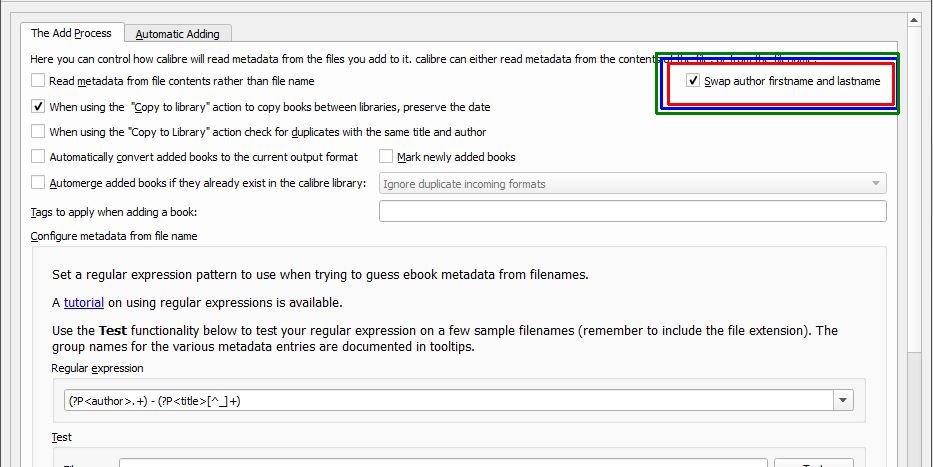 You are correct. At first I thought you were mistaken because that box had no effect on the "test" results that are shown under Preferences / Adding Books, but now I realize that the "swap author first name and last name" means that the actual results when adding the book will differ from the "test" results by appropriately putting the first name first. To hopefully avoid confusion for others I've replaced my prior comments and attachments posted a couple minutes ago with this acknowledgment that you are correct about the importance of that box that you highlighted. I've left in the attachment that shows the comment for that option box is in fact applicable when relying on the filename to define the author and title. Hopefully you will see my revised comments as you form any further response. Thank you !!! Last edited by Rob557; 10-16-2014 at 11:26 AM. Reason: oops |