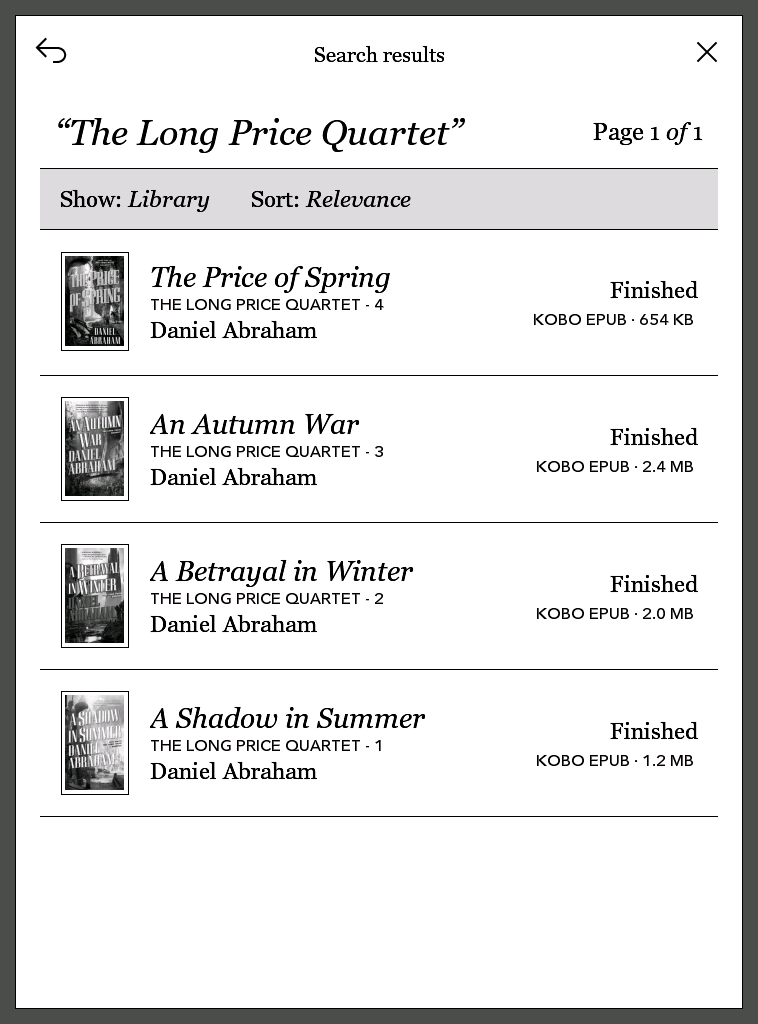 What I do instead is just enable the "Set series information" option in Calibre's KoboTouch driver and set the metadata management option (Preferences > sending books to devices) to automatic, so that the series name shows up in the book information on the device. (Note that you need to reconnect the device to Calibre a second time after transfering the books for the series information to show up). Then I can just search for the series I want, select it from the pick list, and I get a list of all the books in the series. No collections needed. (The books in the screenshots are synced kepubs, but it works exactly the same for sideloaded epubs). Last edited by GeoffR; 11-23-2014 at 08:59 PM. Reason: Added screenshots |