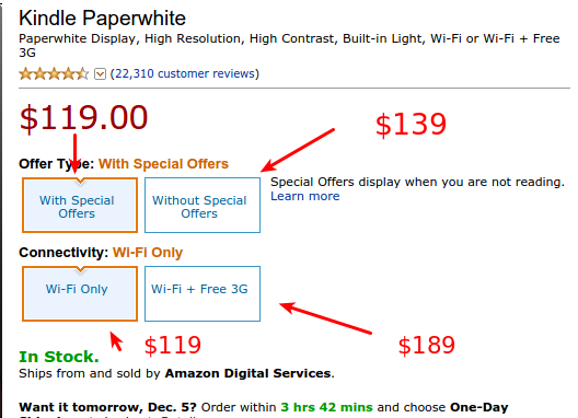 The Kindle Paperwhite pricing and features are confusing. There's four things:
