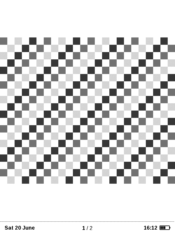 This device, as far as I know, doesn't support screenshots. I created grid pictures, converted them into PDF, and tested them until I found the resolution with which the grid was displayed perfectly. It's 738x964 and can be seen in the screenshots and PDF attachment. As you can see, small black bars show up at the far left and right side of the display. It might be a bug of Sony's software. They appear when the vertical resolution hits 964. PDFs created by k2pdfopt.exe with 738x964 now look way way better than for example with 768x1024. However, in contrast to the perfect grid, I still see some misalignment every now and then. On a PC there is no such trouble. What might be the cause? |