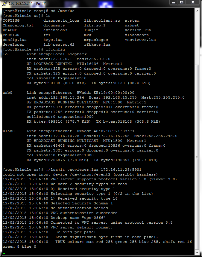 ![]() first: as hawhill said: the scatter error didn't affect the wifi connection. Got the same Message by using it in a working homenetwork. second: the Message: ' not connected' in the Wlan-Settings is 'Amazon-style': if the kindle is connected to wlan but not to internet its 'not connected' third: the testnetwork is set up by a Cisco Air-Cap2602 and with full access to all router settings, so the Problem is definitive not caused by restricted settings. with the cisco router I can connect the kindle in a 192.168.2.x /24 with no internet-access (testnetwork), but if I change the addressrange to a larger area, using IP 172.11.16.28 with subnetmask: 255.255.248.0 than i get a 'Wlan-Error' Message Window by conneting. BUT as long as i stay in this Error-Window the Kindle is connected with the network and it is possible to use - I am running a VNC-viewer by now ![]() So problem solved, work done but still feeling like a monkey on a anthill *don't know why, but it works...* ![]() *the last pic is the verification, that vnc-connection is still online, when I remove the USBnetwork, which I used to control the Kindle Last edited by volkaoth; 02-12-2015 at 10:33 AM. |