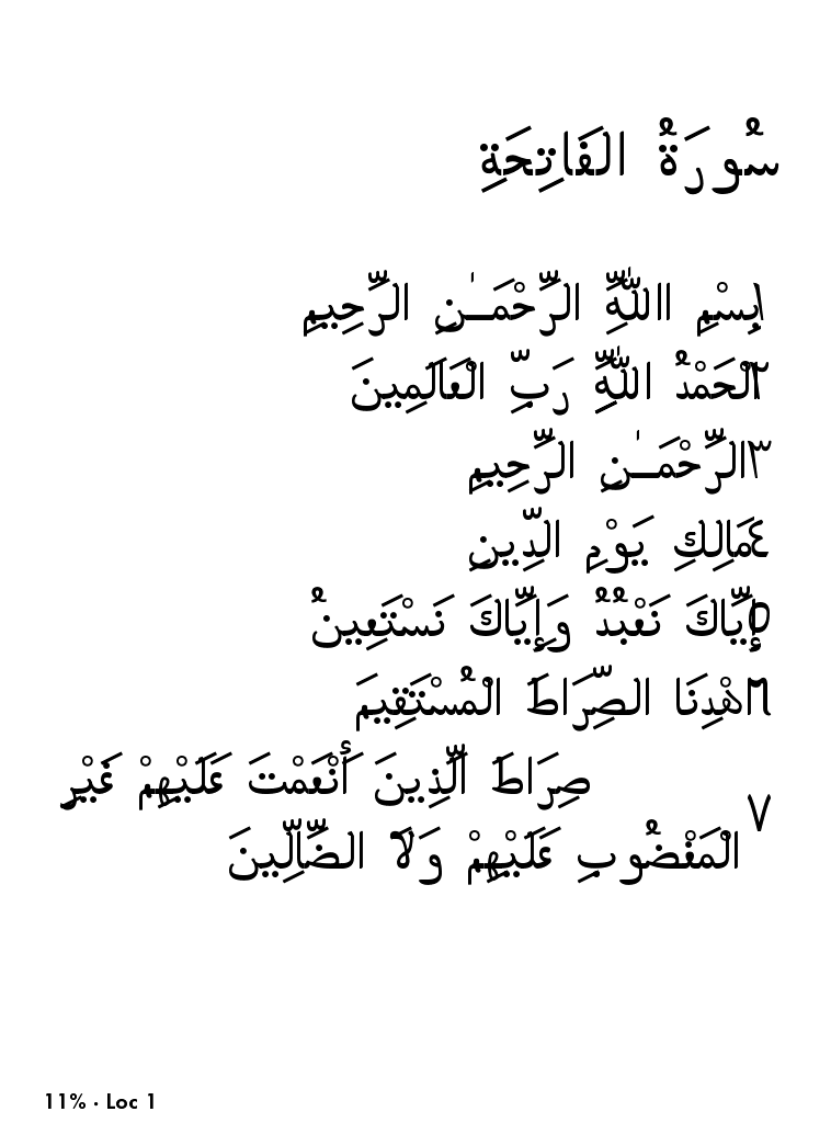 I.e., if you're a typophile or you're mainly reading Arabic books with lots of diacritics in them, you might want to consider a different model, because all current models with a 5.6.x firmware (Basic Kindle, PW2 and Voyage) can't be jailbroken and you can't embed Arabic fonts in AZW3 files. However, if you find a cheap refurbished PW1 (or a PW2 with a 5.4.x firmware) online, you could jailbreak it and install a code2000 override font, e.g. Arial. As for Kobo readers, AFAIK, only some models have RTL support. You may want to ask in the Kobo forum about it. You can post the epub file that I attached and ask them to post a screen capture or let you know whether the text looks like the text in arabic_epub3_Arial.png. (The epub might need to be converted to a Kobo kepub first.) |