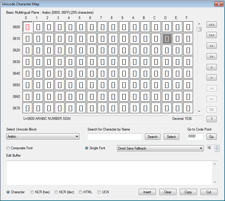 The font hack mainly uses I18N.ttf and code2000.ttf to handle Arabic. But these 2 fonts have valid glyphs for Arabic Unicode range (x0600---x06XX). Now my question is from which other font do the squared fallback glyps come? I checked almost all of the fonts on this font-hack folder and they either have some valid Arabic glyphs there or nothing at all (empty), but not any square-coded fallback glyphs. |