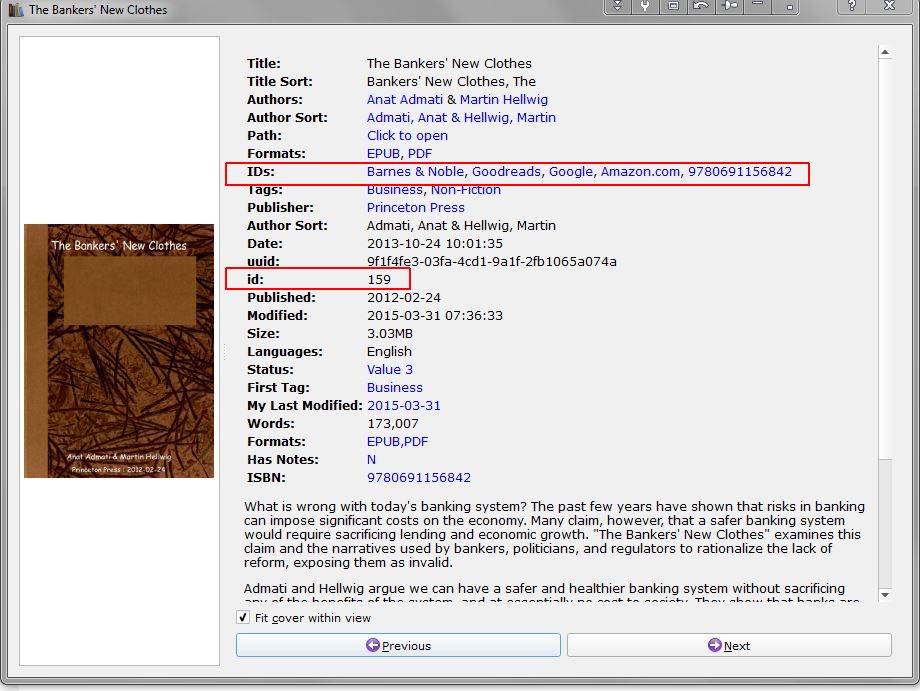The book numbers are the id column of the book table, you are correct there will probably be gaps. The internal column name is 'id' not 'ID', as can be seen in Book Details and in the db schema. I have no idea what its external label is - external labels are shown in the book list column titles, but the id column cannot be displayed as a column in the book list. BR Last edited by BetterRed; 04-10-2015 at 12:43 AM. |