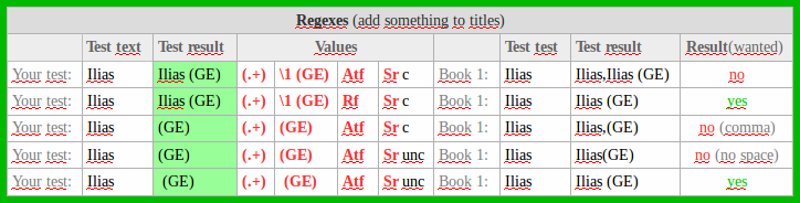 ![]() To comment on the images other experts are called possibly more. Test runs (as practiced in the thread) Atf→Append to field Rf→Replace field Sr→Split result (c→crossed / unc→uncrossed) Summary table (Test text & Test result entries in Your test: and Book 1: etc. rows with different regex values) Test result entries of Book 1: etc. rows are the final (new) titles (tested, without being shown here). Makes sense! Not making sense and IMO illogical is that in Your test: row depending of the regex values the corresponding final results once is Test result entry alone - in other cases these are the Test text & Test result entries together. Not to let us die completely stupid please show by a contrived example what you mean with these ominous ''unwanted side effects''. That would be very interesting and helpful for a better understanding of the whole. Last edited by chaot; 04-13-2015 at 03:33 PM. Reason: Test runs |