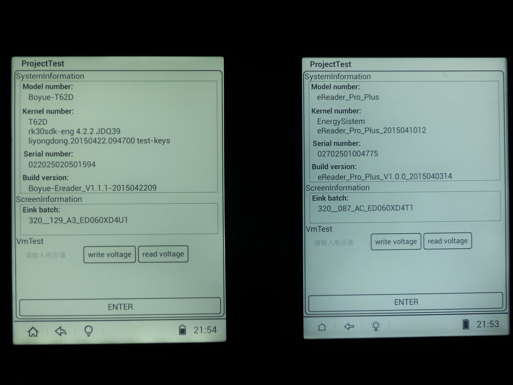 I've just ordered the Energy eReader Pro + and hope to find that it has a screen equivalent to the T62+. Unfortunately, it's going to be my first e-reader so that I have no direct comparison. I wonder whether there is a software hack that could determine the actual screen type instead of relying on the human eyes.
