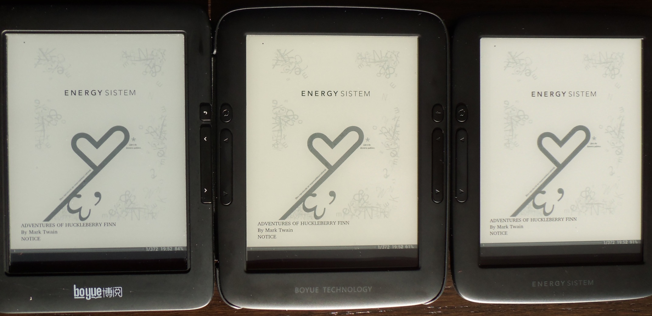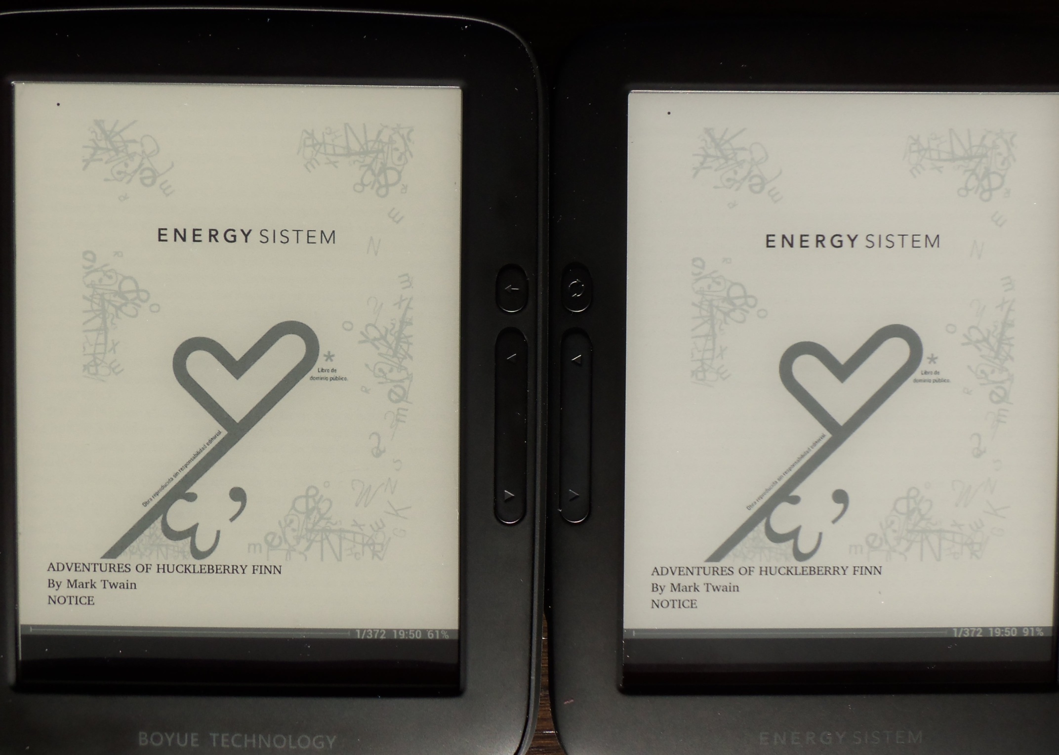I opened the images in photoshop and used the color dropper to get the colours of the blacks and the whites. I can see a very minuscule difference with eyes but the dropper shows it clearer. The whites have a small tint towards the yellows and the blacks are indeed very slightly darker. Energy E-Reader Pro+ Kobo Touch ![]() _______________________ Heres two pictures of the ebook you were using as well. Black shade is almost identical and the white is same as above - a more yellowy tint to it. Energy E-Reader Pro+ ![]() Kobo Touch ![]() I'm quite happy with mine and can see there is a tiny difference, pity I don't have a Boyue to test for you. Maybe they have changed the OS slightly and it behaves different. Try a pure black picture in a gallery app on both perhaps and also a white picture. Best of luck with the support! Last edited by V3t; 06-04-2015 at 08:14 AM. |