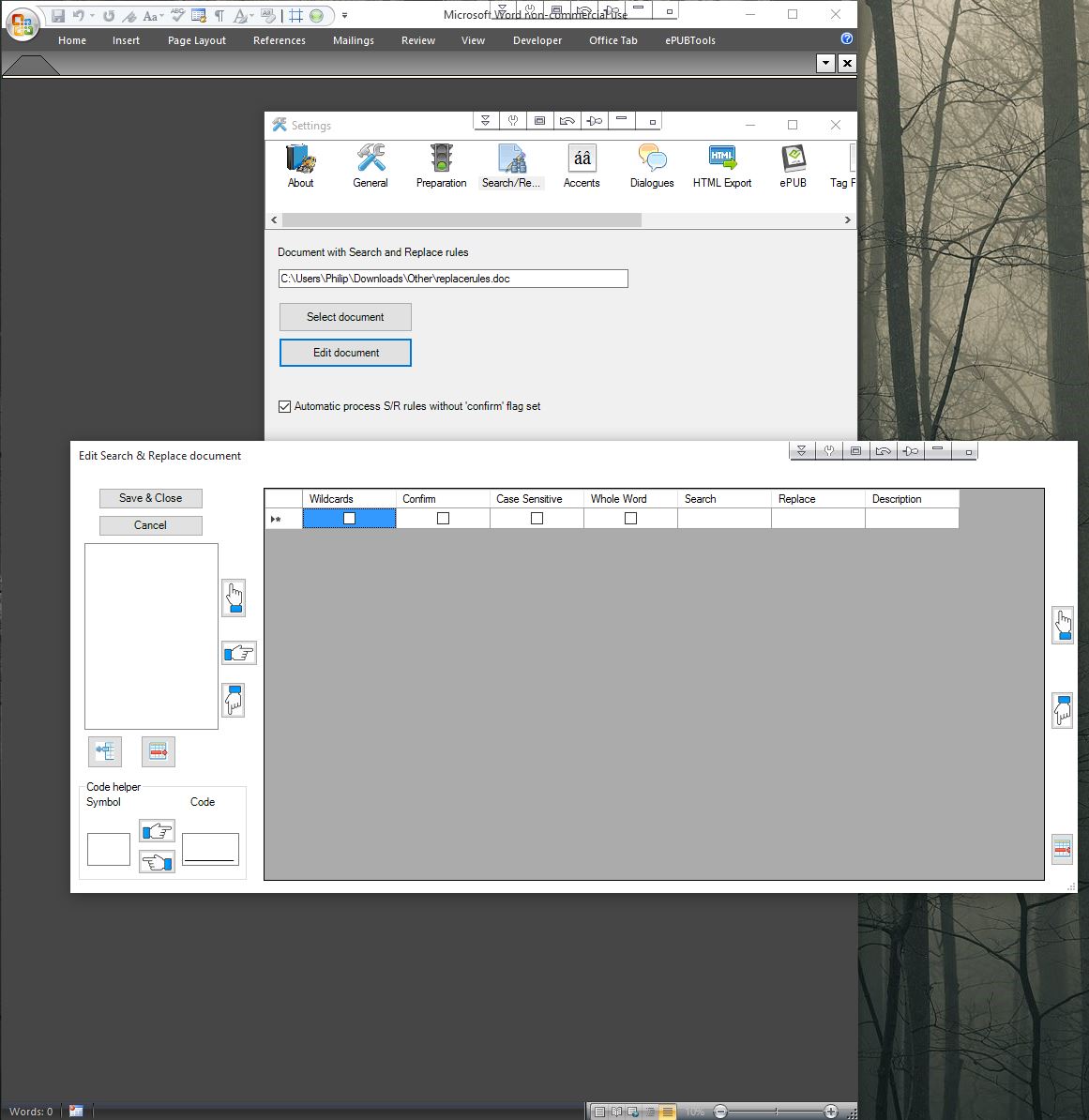 Changelog from 1.12.2 to 1.13.0 New: Progress indicator while creating list of misspelled words New: Added option in S&R rules for the 'Whole Word' option of Word New: During S&R occurrences can be either ignored for the rest of the document or replaced for the rest of the document Update: Better handling of media queries when importing ePUB Update: Improved speed with S&R procedure when starting and moving to other rulesets and rules Update: Reworked S&R rulesets editor. Fix: Ribbon now has its own ID to prevent mixing of multiple ribbons Although an additional option can be used for the rulesets of the S&R procedure, there is no need to change the tables. It will also accept the old format of the tables. The replacement documents on the site have been adapted to reflect the changes to the tables. A selective ignore or replace can be selected for each S&R hit. In that case, the exact same occurrence will be ignored or replaced for that specific S&R rule. If there are other hits for that rule, these will still be found. The ignore was already possible, but the replace is new. |