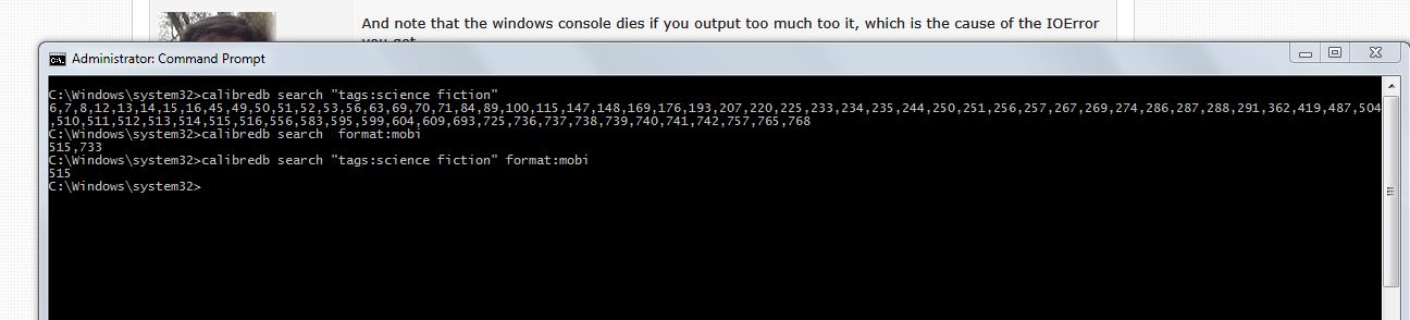 calibredb list -f title --search 'format:=epub and tags:="science fiction"' And note that the windows console dies if you output too much too it, which is the cause of the IOError you got. |