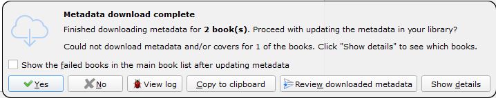 As you say, I'm doing ctrl+D and then alt+B to download in bulk and I get a different message than you. I used to get your message before I upgraded to windows 10 and reinstalled Calibre. My message is in Swedish... but a rough translation is: download of metadata is completed downloaded metadata for 5 books. continue to update metadata in your library? could not download metadata and/or cover for 28 of your books. click on "show details" to see which. and the buttons are: yes -- no -- show log -- copy to capture tool -- remove downloaded metadata -- show details |