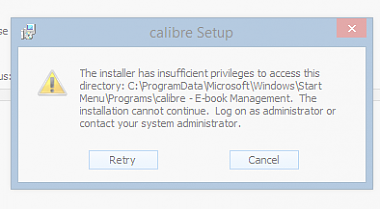 Before doing anything I suggest you take a system restore point see, Create a restore point If anything goes wrong you can restore to this state, see Restore system files and settings First, try running a lightweight registry cleaner, I suggest Piriform Ccleaner. Then try the install again If that doesn't fix it try this Start the install, after ticking the agree to license box, go into Advanced, viz: I would try these before AnotherCat's suggestion to modify permissions of C:\ProgramData\Microsoft\Windows\Start Menu. Accept the install location. Then in the next popup turn off start menu, viz: The first one will get rid of registry cruft - including invalid locations - which is no bad thing, and it shouldn't do any harm. The second one is calibre specific. IMO it's better to avoid changing security settings on system owned folders such as the Start Menu folder because the changes will apply to all applications that use the folder. If something works let us know which one. Added : Ah, just saw your post re portable. You really shouldn't need to be doing anything as Admin. Seems to me you have a badly configured or corrupt Windows install. BR Last edited by BetterRed; 09-27-2015 at 11:01 PM. |