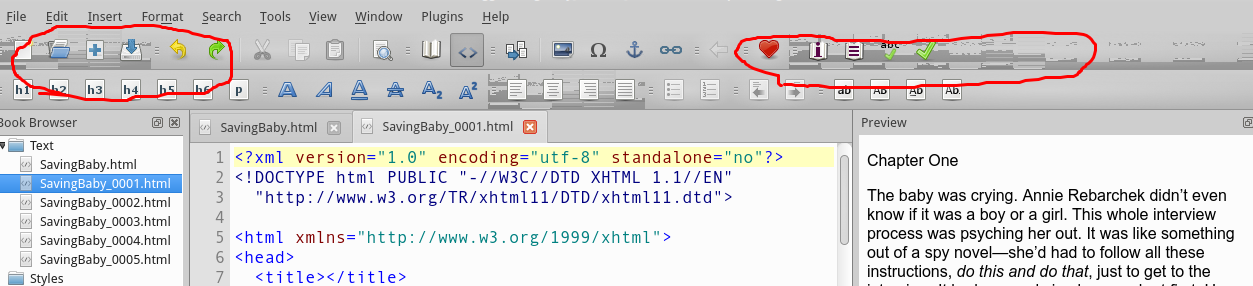 Yes, I do that incremental version saving, but only day-by-day. Anyway, I did the renaming to a zip and opened it up and the last file I split got gigantic (see screenshot 73). I opened that gigantic section 10 html file in Kate and there were tons of non-breaking spaces. It started here (075) and ended here (076). I use this as the break point between chapters: <p class="asterisks">* * *</p> I don't know. There is a beginning and ending P tag in Kate so that seemed normal, but somehow the non-breaking spaces multiplied exponentially. It seems to me (and I am a non-techie) that all those non-breaking spaces overwhelmed the file and probably broke/corrupted it. I checked one of the other html files in a text editor and it looked normal. The Sigil version on the computer I used is 0.8.4 by John Schember and you(?) and some others. I'm using an old Dell (Optiplex 170L) and running Xubuntu 15.04. If you can check the second to last post (to theducks) there's a screenshot of some distortion I've been having since I upgraded the computer to 15.04. But the computer has been (besides that inconvenience) functioning excellently. And it looks like the hard drive is okay. (77) the ducks suggested a way of spitting the chapters and it worked well. Anyway, that's about all I can think of. Thank you. |