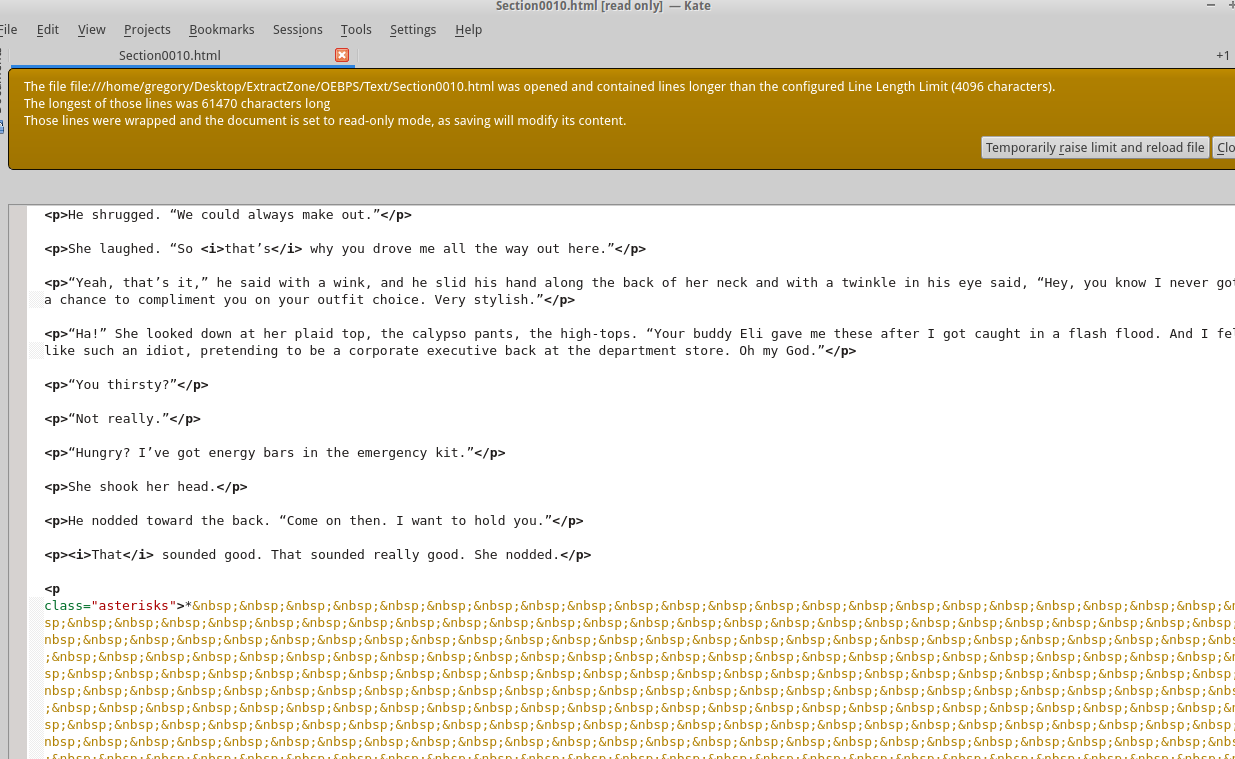 Yes, I do that incremental version saving, but only day-by-day. Anyway, I did the renaming to a zip and opened it up and the last file I split got gigantic (see screenshot 73). I opened that gigantic section 10 html file in Kate and there were tons of non-breaking spaces. It started here (075) and ended here (076). I use this as the break point between chapters: <p class="asterisks">* * *</p> I don't know. There is a beginning and ending P tag in Kate so that seemed normal, but somehow the non-breaking spaces multiplied exponentially. It seems to me (and I am a non-techie) that all those non-breaking spaces overwhelmed the file and probably broke/corrupted it. I checked one of the other html files in a text editor and it looked normal. The Sigil version on the computer I used is 0.8.4 by John Schember and you(?) and some others. I'm using an old Dell (Optiplex 170L) and running Xubuntu 15.04. If you can check the second to last post (to theducks) there's a screenshot of some distortion I've been having since I upgraded the computer to 15.04. But the computer has been (besides that inconvenience) functioning excellently. And it looks like the hard drive is okay. (77) the ducks suggested a way of spitting the chapters and it worked well. Anyway, that's about all I can think of. Thank you. |
