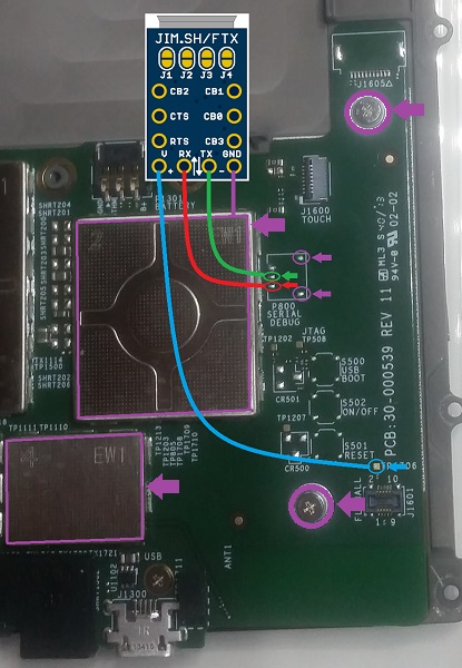 Converter Kindle Board On Diagram V TP1706 Blue Arrow GND (Any Ground) Purple Arrows RX Left Serial Red Arrow TX Center Serial Green Arrow Here is a close-up of my own soldering adventure: 6. Reconnect screen and battery Your kindle needs powah...! Reconnect: