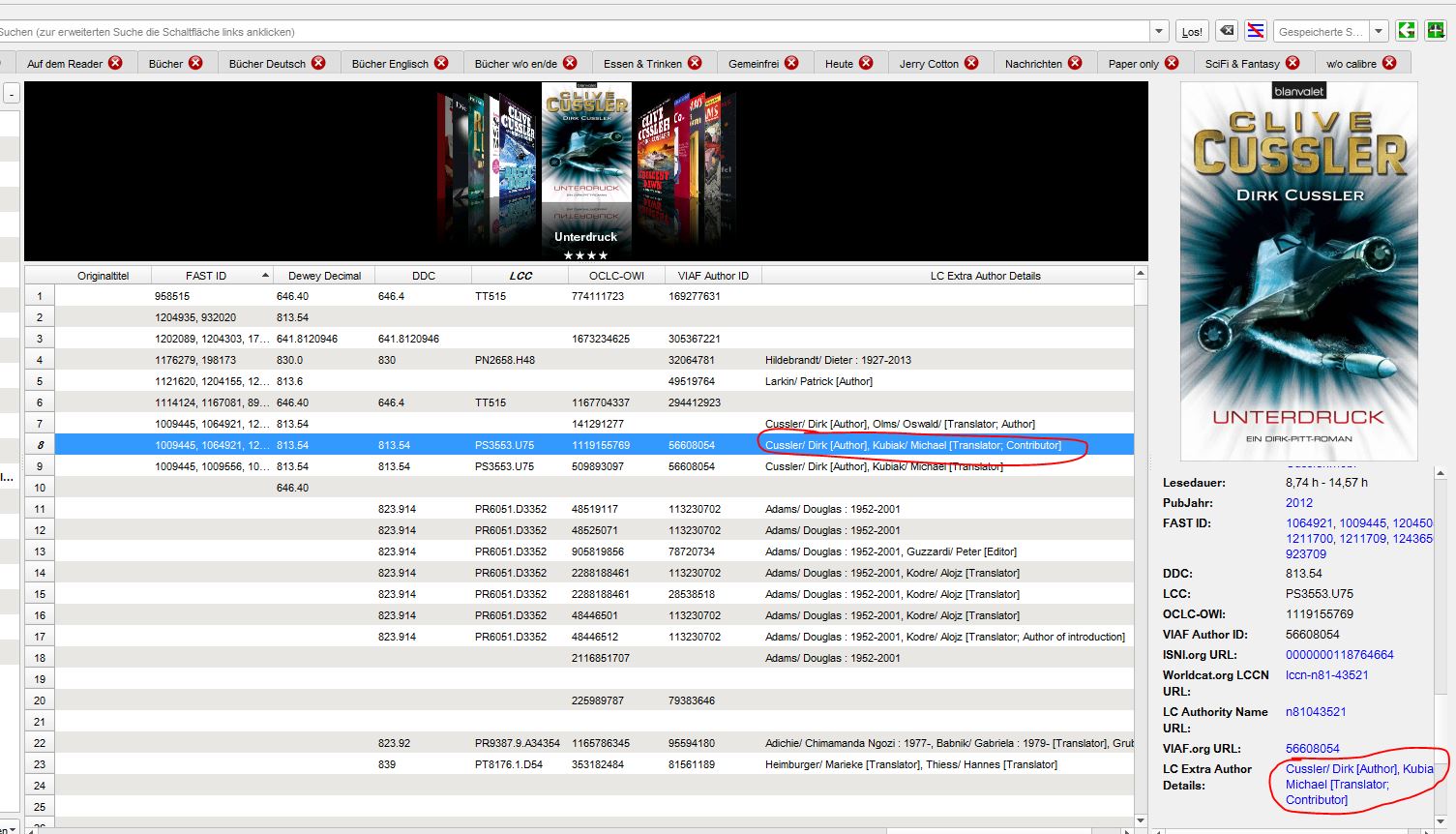 Version 1.0.9 - 2015-11-23 New Optional Custom Column: LC Extra Author Details (LCEAD), which is a Tag-Like column that is updated with additional author-related information. It is automatically updated when deriving DDC/LCC, but can be separately updated via its own menu option that uses OCLC-OWI to obtain the LCEAD values.