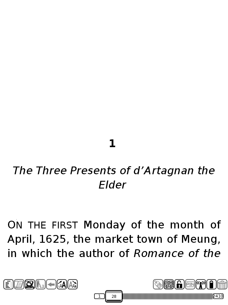 The last scan is from OpenInkPot (FBReader based), it does not honor the CSS for a chapter start, and the text starts with all caps. In OpenInkPot the TOC works either via following links from the in-lined TOC or by bringing up the TOC menu item and selecting the chapter from a list. This is the same behavior you see with Desktop FBReader. |