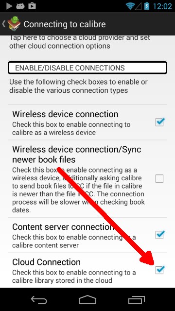 Cloud connection is NOT ticked the normal connect menu shows : wireless/sync content server Cloud BTW this is a TAB 2 android 4.2.2 with the CC library on the SD card PS I am not that tablet literate. I find it amazing, they assume we know all the magic taps and swipes and they don't cover much in the manual. |