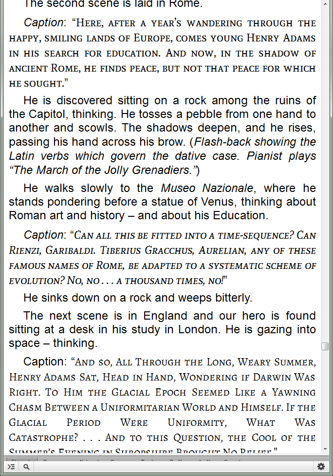 <p>“T<span class="smcaps">WENTY</span> Y<span class="smcaps">EARS</span> A<span class="smcaps">FTER</span> . . . H<span class="smcaps">ENRY</span> A<span class="smcaps">DAMS</span> I<span class="smcaps">S</span> N<span class="smcaps">O</span> L<span class="smcaps">ONGER</span> Y<span class="smcaps">OUNG</span>, <span class="smcaps">BUT</span> <span class="smcaps">IN</span> H<span class="smcaps">IS</span> H<span class="smcaps">EART</span> L<span class="smcaps">IES</span> S<span class="smcaps">TILL</span> <span class="smcaps">THE</span> H<span class="smcaps">UNGER</span> <span class="smcaps">FOR</span> E<span class="smcaps">DUCATION</span>. G<span class="smcaps">OING</span> F<span class="smcaps">ORWARD</span>, E<span class="smcaps">VER</span> F<span class="smcaps">ORWARD</span>, H<span class="smcaps">E</span> R<span class="smcaps">EALIZES</span> <span class="smcaps">AS</span> N<span class="smcaps">EVER</span> B<span class="smcaps">EFORE</span> <span class="smcaps">THAT</span> W<span class="smcaps">ITHOUT</span> T<span class="smcaps">HOUGHT</span> <span class="smcaps">IN</span> <span class="smcaps">THE</span> U<span class="smcaps">NIT</span>, T<span class="smcaps">HERE</span> C<span class="smcaps">AN</span> B<span class="smcaps">E</span> <span class="smcaps">NO</span> U<span class="smcaps">NITY</span>. T<span class="smcaps">HOUGHT</span> A<span class="smcaps">LONE</span> I<span class="smcaps">S</span> F<span class="smcaps">ORM</span>. M<span class="smcaps">IND</span> <span class="smcaps">AND</span> U<span class="smcaps">NITY</span> F<span class="smcaps">LOURISH</span> <span class="smcaps">OR</span> P<span class="smcaps">ERISH</span> T<span class="smcaps">OGETHER</span>.”</p> At the moment, wishing to lean towards READABILITY rather than PRETTY, also known as "Mimic the Print Book", I am leaning towards Monospace in normal Sentence Case. (Camel Caps are hard on the eyes in large quantities, I think.) What do you think? Last edited by GrannyGrump; 01-07-2016 at 01:49 AM. |