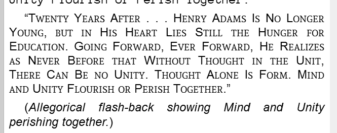 <p>“T<span class="smcaps">WENTY</span> Y<span class="smcaps">EARS</span> A<span class="smcaps">FTER</span> . . . H<span class="smcaps">ENRY</span> A<span class="smcaps">DAMS</span> I<span class="smcaps">S</span> N<span class="smcaps">O</span> L<span class="smcaps">ONGER</span> Y<span class="smcaps">OUNG</span>, <span class="smcaps">BUT</span> <span class="smcaps">IN</span> H<span class="smcaps">IS</span> H<span class="smcaps">EART</span> L<span class="smcaps">IES</span> S<span class="smcaps">TILL</span> <span class="smcaps">THE</span> H<span class="smcaps">UNGER</span> <span class="smcaps">FOR</span> E<span class="smcaps">DUCATION</span>. G<span class="smcaps">OING</span> F<span class="smcaps">ORWARD</span>, E<span class="smcaps">VER</span> F<span class="smcaps">ORWARD</span>, H<span class="smcaps">E</span> R<span class="smcaps">EALIZES</span> <span class="smcaps">AS</span> N<span class="smcaps">EVER</span> B<span class="smcaps">EFORE</span> <span class="smcaps">THAT</span> W<span class="smcaps">ITHOUT</span> T<span class="smcaps">HOUGHT</span> <span class="smcaps">IN</span> <span class="smcaps">THE</span> U<span class="smcaps">NIT</span>, T<span class="smcaps">HERE</span> C<span class="smcaps">AN</span> B<span class="smcaps">E</span> <span class="smcaps">NO</span> U<span class="smcaps">NITY</span>. T<span class="smcaps">HOUGHT</span> A<span class="smcaps">LONE</span> I<span class="smcaps">S</span> F<span class="smcaps">ORM</span>. M<span class="smcaps">IND</span> <span class="smcaps">AND</span> U<span class="smcaps">NITY</span> F<span class="smcaps">LOURISH</span> <span class="smcaps">OR</span> P<span class="smcaps">ERISH</span> T<span class="smcaps">OGETHER</span>.”</p> At the moment, wishing to lean towards READABILITY rather than PRETTY, also known as "Mimic the Print Book", I am leaning towards Monospace in normal Sentence Case. (Camel Caps are hard on the eyes in large quantities, I think.) What do you think? Last edited by GrannyGrump; 01-07-2016 at 02:49 AM. |