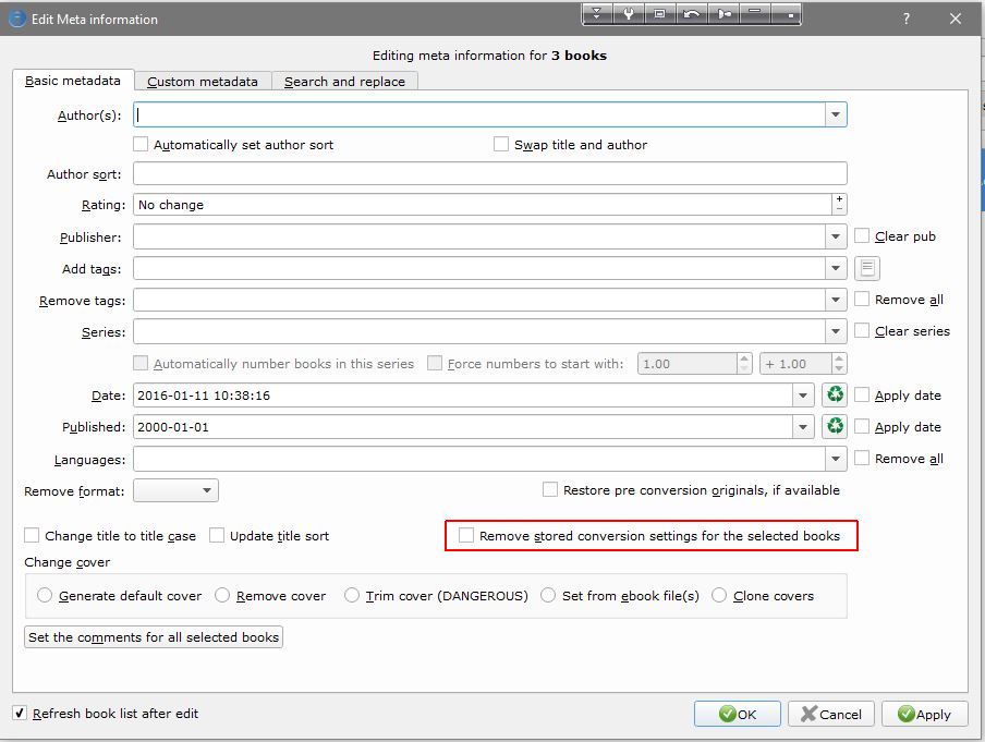 You can remove book specific conversion settings, thus reverting to defaults you have in preferences, in bulk metadata edit, viz: Select all your books via Ctrl+A with no active VL or search, tick the box, click Apply - should only take moments because the settings are in the database. BR Last edited by BetterRed; 01-10-2016 at 07:55 PM. |