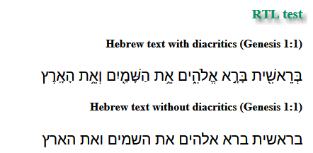 <p class="hebrew" dir="rtl" xml:lang="iw">בְּרֵאשִׁ֖ית בָּרָ֣א אֱלֹהִ֑ים אֵ֥ת הַשָּׁמַ֖יִם וְאֵ֥ת הָאָֽרֶץ</p> and, if I remove the "dir="rtl"" then it appears as: (the cut and paste of the following has the rest of this post working rtl, so I'll leave it here.) בְּרֵאשִׁ֖ית בָּרָ֣א אֱלֹהִ֑ים אֵ֥ת הַשָּׁמַ֖יִם וְאֵ֥ת הָאָֽרֶץ |