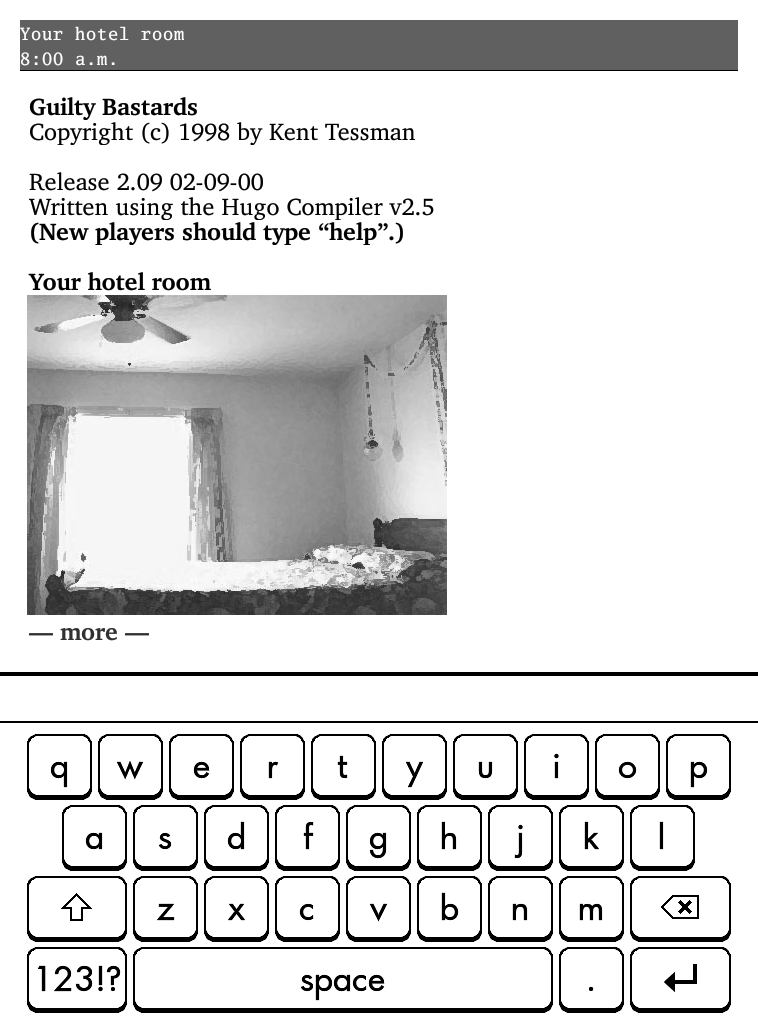 So, here goes.. The Hugo interactive fiction design system: http://www.generalcoffee.com/old/hugo.html Sample game: "Guilty Bastards"..: http://www.ifarchive.org/if-archive/...ugo/guilty.zip Copy the "guilty.hex" and "GBDATA" files from the zip to the kindle.. Screenshot attached..
