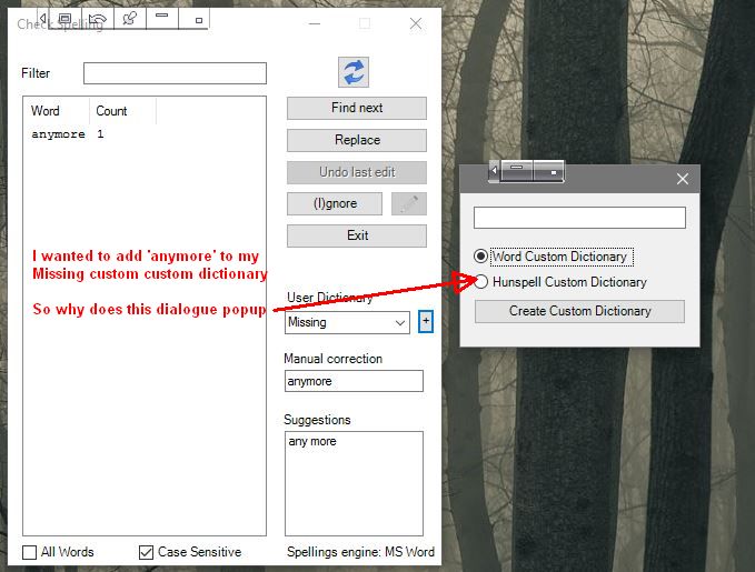 The 'Add to Dictionary' will add the word only to the selected user dictionary in the dropdown box. As this is also the used user dictionary, this avoids confusion and makes the most sense as this is the custom dictionary actually used. I do not know what the checkbox does in the Word settings for custom dictionaries, although I can guess of course. As far as I know I cannot influence that with programming nor check if a custom dictionary is checked there. There is no property to check that. I have looked into the documentation, but so far found nothing. When I retrieve the list of active custom dictionaries from Word, I get them all, checked and unchecked. Even worse, if you add words to a custom dictionary in Word, you need to restart Word before it gets active for Word itself. Since my spelling procedure works differently, that is no need for a restart. |