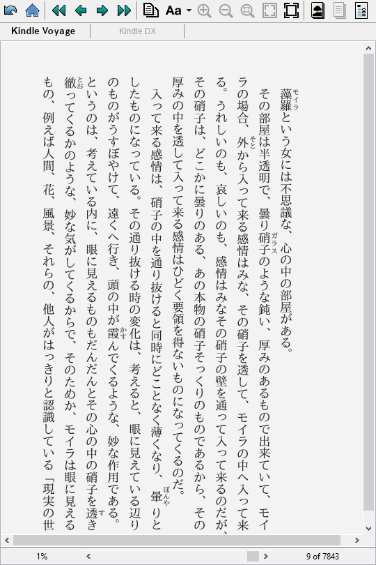Hello. My Kobo aura HD screen just broke and I am now strongly considering buying the Kindle paperwhite 2015. I get all my Japanese books by converting a text file to an epub. I tried converting some of these text files to mobi and I am curious if they work properly. I'd like someone (preferably with a Kindle Paperwhite 2015) to open these and try to scroll through a bit, select text, etc. and report to me if there are any issues such as lagging. If it's possible I'd also like a screenshot or two. example 1.mobi [松本清張] example 2.mobi [安部公房] example 3.mobi [田中ロミオ] 人類は衰退し.azw3 [森 茉莉] 甘い蜜の部屋.mobi 4 of them are mobi, one is azw3. All are in Japanese. Here is a screenshot of what example 1 is supposed to look like. I am especially concerned if the small text next to some letters (circled with red on screenshot) display Ok. Last edited by ire; 03-22-2016 at 03:29 PM. |