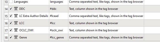 calibredb add_custom_column --library-path="/path/to/library" ddc DDC text calibredb add_custom_column --library-path="/path/to/library" lcc LCC text calibredb add_custom_column --library-path="/path/to/library" --is-multiple lcead "LC Extra Author Details" text calibredb add_custom_column --library-path="/path/to/library" oclc_owi OCLC_OWI text |