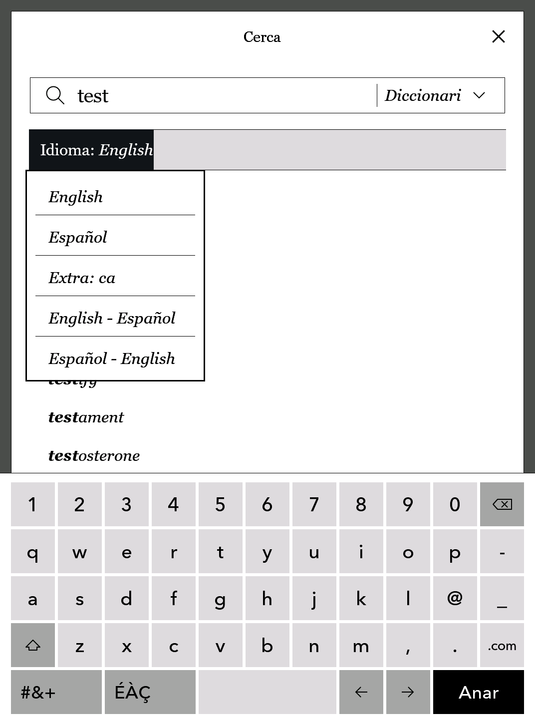 When reading a catalan book i can press on a word and get its meaning, nice! ;-) But if a made a search to dictionaries from main screen, there is a bug ;-( If I select “Extra: ca” language shows “English - English” and word is not found. On the other hand, French dictionary does'nt appear on dictionaries when searching, although I have it installed, and works well when reading a french book. !? |