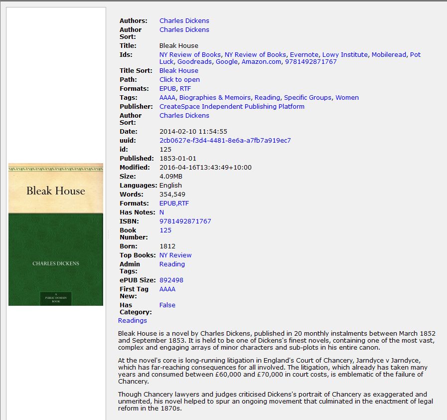 Meantime you could put a file link into the split-off books' Comments columns (or custom long text columns) to the anthology book folder in which you have stored a book format with the metadata in a form suitable for humans - maybe an epub that just has a book jacket. Or maybe there's a program that can present (probably in a browser) a metadata.opf in a format suitable for humans - it would need to style it somehow. You'll see what I mean if you drop a metadata.opf into a browser BR |