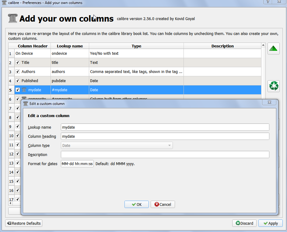 ![]() I wonder if in Calibre it's possible to set a custom column with date and time. It's because when I add new books, of course, the modify column show me the date, however, if I make a full modification of data (whatever it was), all the books show the same date, of course, because all books change some information, even if the data change or not. I notice that Calibre knows which books are recently modified, because when I sort by modified, so the time looks to me usefull. It's possible to create a custom column with this criteria? Again, sorry my grammar if I make mistakes Best regards from Lima, Perú Blessings and have a nice sunday |