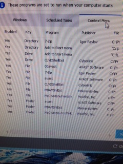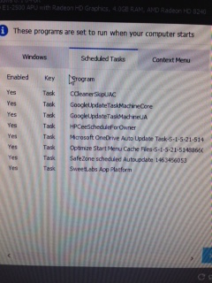 Picture one: Cleaner Monitoring looks like the Pro resident version. I use the freeware version and do on demand scanning. It can come out of startup. AvastUI is likely the AV component. Leave it. (I use MS's built-in on Win10, and don't run A?V elsewhere.) I'd leave the HP stuff. StartCCC is the Catalyst Control Center app for the AMD-ATI graphics card. It gives you a GUI to adjust graphics card parameters. It is not the actual graphics driver - just an interface to it. I have an AMD-ATI graphics card in the desktop. Win10 said CCC was incompatible with it when I upgraded, but it was still there and apparently worked. I never actually used it to fiddle with the card, so I removed it from Add/Remove Programs. Picture 2: CCleaner SkipUAC also looks like a Pro version component. I have no idea what the Sweet Labs app platform is, and I'd want to find out. The other stuff should probably stay. Picture 3: I am mystified at what 7-zip is doing in Startup. I have it here as my standard archive utility, and it's associated as the app to open all that archive types it understands. (It replaces Windows built-in Zip folder functionality). But it's not a startup app and has no reason to be. I also note entries for both Avast and McAfee. I'll guess that Avast is the resident A/V, so what is the McAfee entry for? In general, you don't want to run more than one Z/V app at the same time. They tend to get in each other's way and step on each other's toes. Malware Bytes also seems to have a resident component. This is another Pro feature. (I run the freeware version once in a while as on-demand scanning, but haven't configured it to be resident. If you installed it, it looks like you selected the "Try Pro features for 30 days free" option in the install. If you ran it and deleted what it found, it can go away using the standard Windows Add/Remove Programs facility. ______ Dennis |