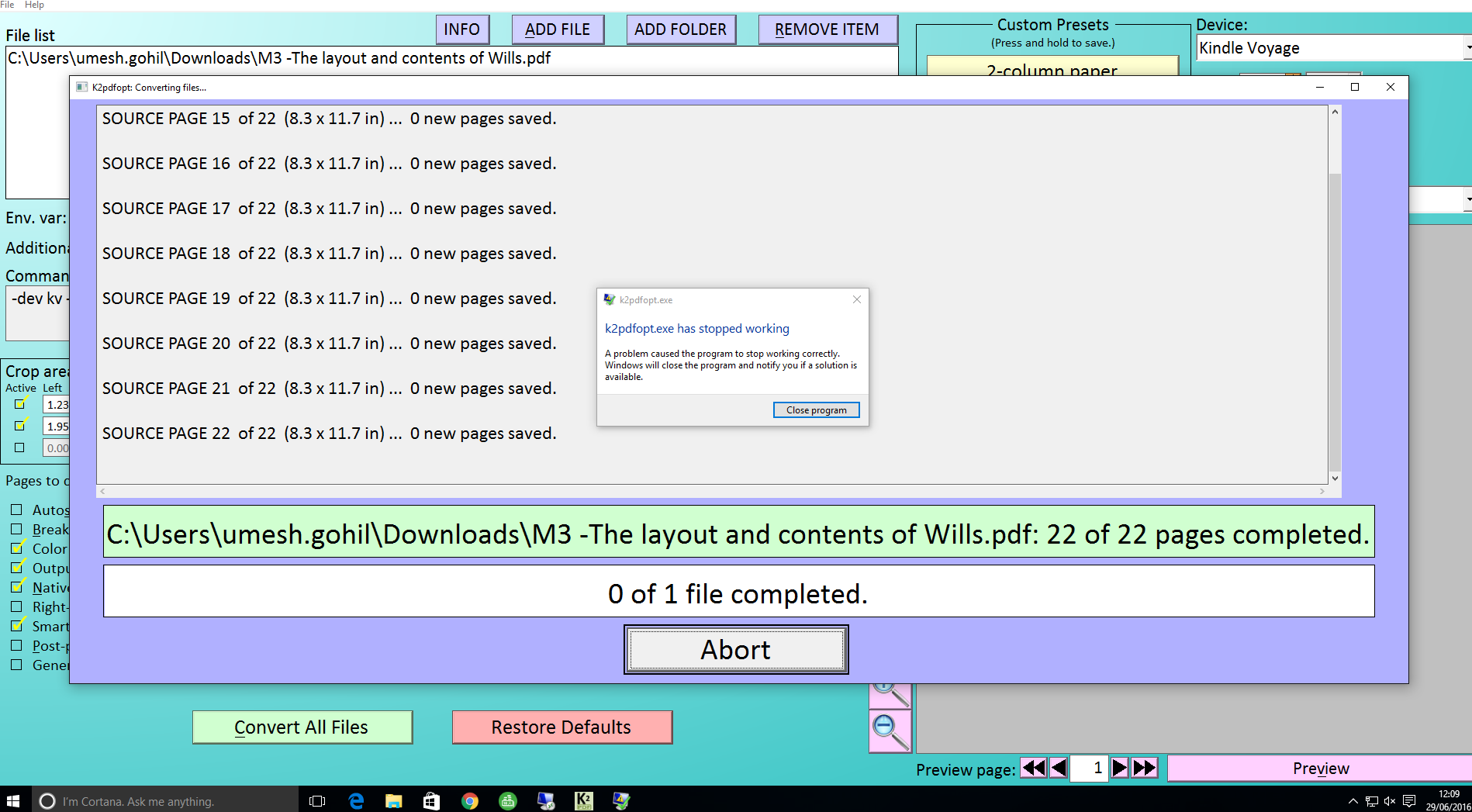 I have been using a recommended command from you to optimize a magazine for reading on my kindle. There are a few cases where it fails, so perhaps my command needs further tweaking. The current command line is: