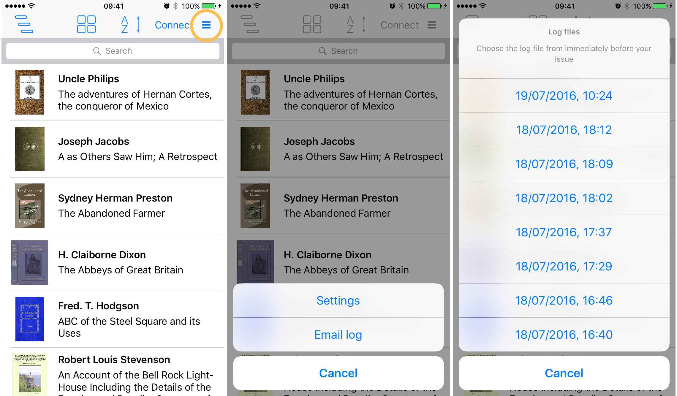 I'm Michael, one of the developers at MultiPie working on CC iOS. Thanks for all your help so far with testing the app. Feel free to report anything you believe is broken. The only issue we're aware of at the moment is the changing icon sizes at the top (and features that don't exist yet of course!). If you encounter any more issues, it would be useful if you could send a log from inside Calibre Companion. I've attached a screenshot showing where you can find the buttons. The most recent log is for the current session, so if you just encountered a crash you'll probably want to send the 2nd item in the list.