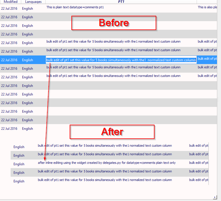 1 of 2 shows using F2 to edit a single column of a single book. That column is datatype=comments with is_plain_text = True. The editor used does NOT use a "completer" with a dropdown. No suggestions. Just a simple line edit function. 2 of 2 shows using F2 to do the same thing, except the column is datatype=comments with is_plain_text = False. This is the original comments custom column editor for HTML text. In the table custom_columns image, the unused (but available for plugins to use henceforth) attributes are shown: is_base64 and mimetype. Only custom columns created after the code was changed will show those new attributes, unless a custom column is manually changed in Preferences for any reason. If they don't have them, then implicitly their value is either 'false' or '', depending on the attribute. No harm and no foul if they are never changed in the future. DaltonST |