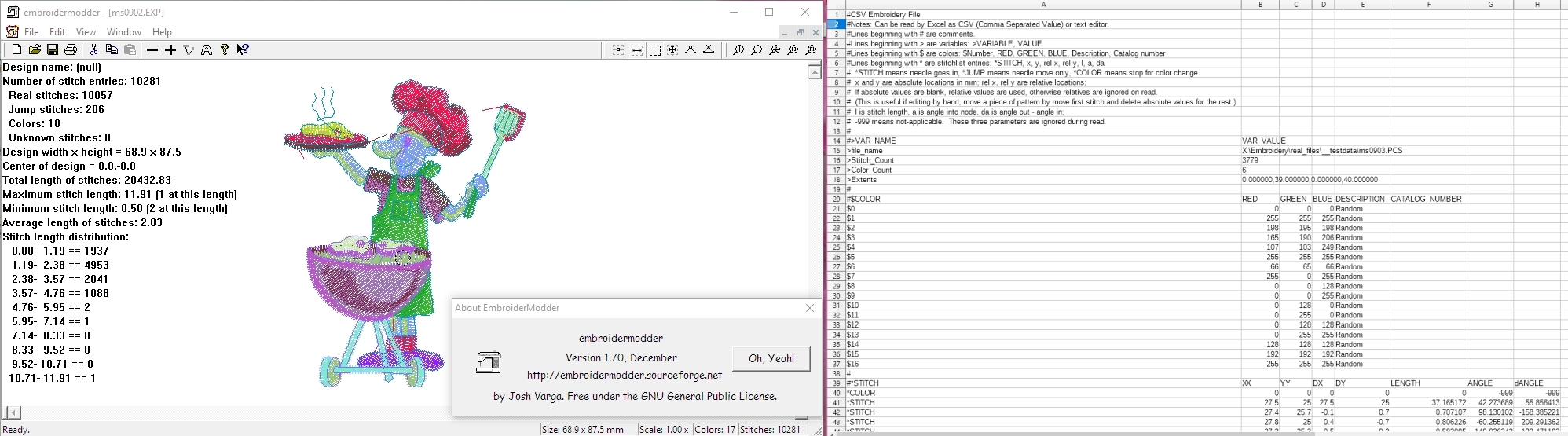 Thank you for your detailed answers. I found the "embroidermodder" software you mentioned to be very informative. Feed it a machine embroidery file format, and it spits out a .csv of its contents, plus creates statistics and an image. Example is attached. Given the availability of these fine statistics and .csv data, I am not sure exactly what, if anything, I need to add to the MFI plug-in to enhance the Dynamic Variable {embroidery_file_info}. DaltonST |