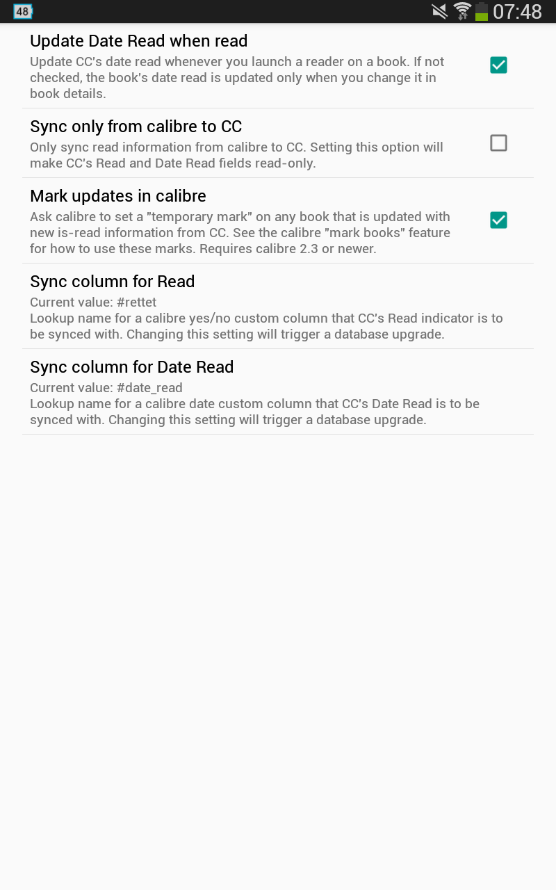 I've tried uninstalling and re-installing the app a couple of times now, but it doesn't automatically change the date read, as you can see in the screenshot it should do it, but whenever I read a book and return to CC it still says "Set Date Read" in the metadata. Also when I sync back to Calibre, it doesn't mark the books which has metadata, that has been changed.