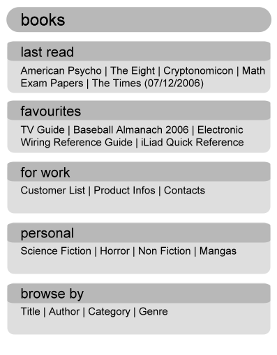 my perfect 'books' starting page would look like this (sorry for bad graphics).