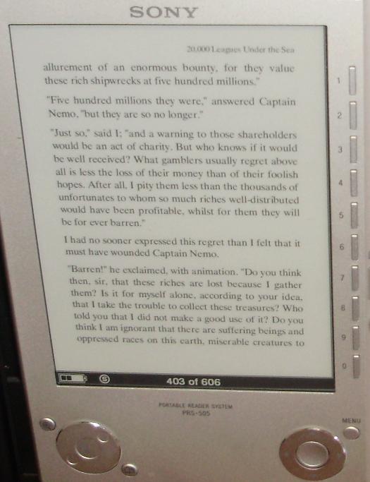Again, I think Sony Reader has the best screen layout solution. Simple, informative and efective. Why not copy it? It isn't exacly copyrighted, nor it is immoral or even remotely shamefull! It is just - in my opinion, naturally - the best solution. See picture under. Regards Nelson Last edited by nelsonescorcio; 01-04-2009 at 10:55 AM. |