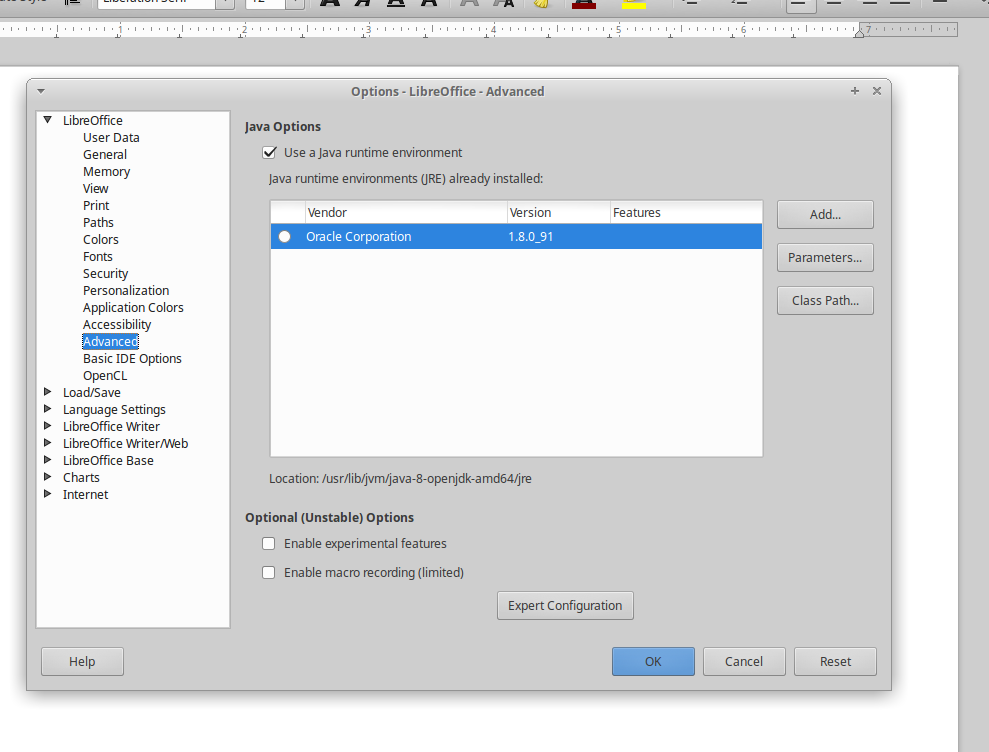 sudo apt-get install default-jre After the JRE installation you'll need to check the “Use a Java runtime environment” in LibreOffice. |