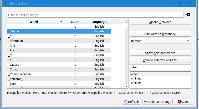 However, when I'm stepping through spell check to fix mis-scanned words (almost always with a count of 1) and when I click [Replace With] SC seems to refresh (takes a while for long books) and repositions to the first entry again. So I have to wait and the scroll to find the word after the one that was just replaced It'd be a lot faster and easier to just replace the text without refreshing automatically and position the line in the errors to the next misspelt work Is there any way or setting to do that, or is a program enhancement required? Last edited by phossler; 11-06-2016 at 11:02 PM. |