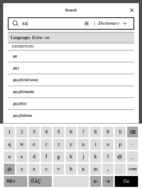 Problems of the GUI not displaying certain characters, even though a suitable custom font is installed, have been mentioned several times. Lately, I had this problem myself. I installed a Sanskrit-English dictionary (Sanskrit being transliterated with diacritics). In order to be able to search the dictionary, I patched the keyboard. But some characters did not show (cf. screen_01.png). They did also not show in the list of suggestions (cf. screen_01.png, screen_02.png). The problem is that the automatic font selection does not always yield the wished for results. What I tried was to remove the font or the fonts that get applied instead of the font that should be applied. Actually, I renamed the directory that contains the on-board fonts.