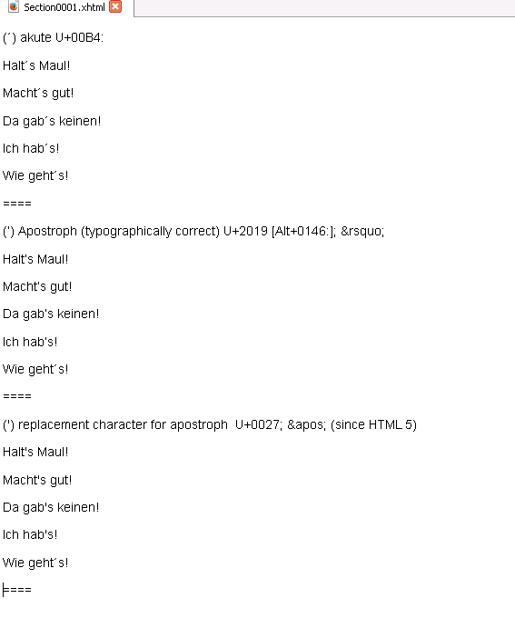 You can hover with the mouse over the keys. https://de.wikipedia.org/wiki/Tastat...C3.96sterreich At the left side of the backspace key you can see (`) Gravis (´) Akute (’) The (typographically correct) Apostroph is not accessible with a key, you have to type ALT+0146 (see https://de.wikipedia.org/wiki/Apostr...afisch_korrekt) At the left side of the return key (together with #): (') Apostroph (typographically incorrect/replacement character) (https://de.wikipedia.org/wiki/Apostr...rafisch_falsch) So a typically German (like me) takes this (') (typographically incorrect) Apostroph or (´) Akute (which is wrong) The Gernan Duden (Dictionary of the German language) uses the (typographically incorrect) (') Apostroph in the article about Apostroph: http://www.duden.de/sprachwissen/rec...geln/apostroph So i checked this with the only spellchecker of Duden: Duden | Rechtschreibprüfung Online Betaversion http://www.duden.de/rechtschreibpruefung-online (´) akute U+00B4: Halt´s Maul! Macht´s gut! Da gab´s keinen! Ich hab´s! Wie geht´s! (’) Apostroph (typographically correct) U+2019 [Alt+0146:]; ’ Halt’s Maul! Macht’s gut! Da gab’s keinen! Ich hab’s! Wie geht’s! (') replacement character for apostroph U+0027; ' (since HTML 5) Halt's Maul! Macht's gut! Da gab's keinen! Ich hab's! Wie geht's! As you can see the text is correct using the acute symbol and using a real apostrophe gives a misspelled word: So they do it wrong! I checked this again with Sigil and the German Hunspell dictionary. It does the same mistake. Additional I used the HTML-Entities ' ’ but they are converted to the real characters during saving. This is the new version of the testcase epub: https://www.mobileread.com/forums/at...1&d=1485176688 What can i do to make the differences between the acute and the tweo versions of apostroph visible in the book views of Sigil? Last edited by AnselmD; 01-23-2017 at 09:17 AM. |