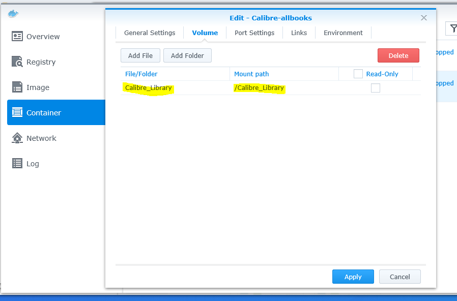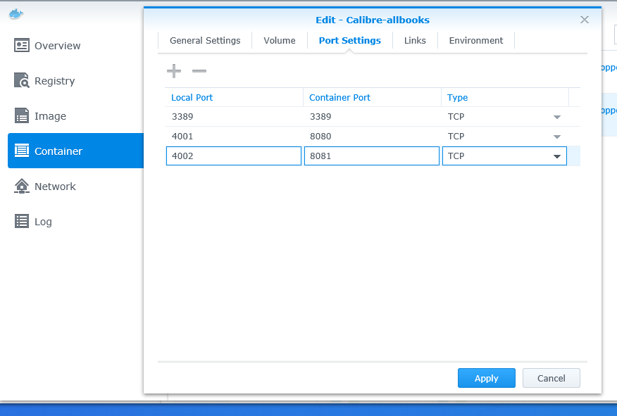 Hi, If you already have your existing calibre ebook library and want to use it for Calibre in Synology Docker, you have to map your existing ebook library to Calibre Docker in Syno by going into the Volume tab (see screenshot attached), click "add folder", under File/Folder column, search and select your existing ebook library folder (for me, it is a shared folder named "Calibre_Library" in my Synology); then under "Mount Path" column, you name a folder name you want (any name) starting with "/"; then save. When you first run your Calibre in Docker (see which port to use below), it will start with Calibre setup wizard and it will ask you where your ebook library is located, click browse, you will see "nobody/Calibre…" folder, you need to click the arrow up icon till you see the root directory; then you will see the folder name you mount earlier, choose it. Calibre will then use your existing ebook library. Now, how can you access the full Calibre gui from browser: - After you start the Calibre container, go into the "Details" page of the container, it will show you 3 port mapping numbers (see my attached screenshot). Usually, you need to know 2 of the 3 port numbers, i.e. 8080 (Full Calibre GUI) and 8081(Calibre content server for OPDS in your Moon+Reader Net Library). My example, 32775 is mapped to 8080, 32274 to 8081 (you may have different external port numbers of 3xxxxx) - to access full Calibre GUI, in your internet browser, type 192.168.x.x:32275, it will display a menu for you to choose Calibre to run; then you will find the Calibre setup wizard. Choose your existing ebook library as explained earlier. - before you can access you Calibre content server, you have to change from port number 8080 to 8081 in the content server setup page inside the Calibre GUI. - As the external ports 3xxxxx above will change every time your synology restart, you have to fix the external port number. You can go into the Port Settings tab (in Calibre container) and change them. For me, I change them from Auto to 3389, 4001, and 4002 (see my attached screenshot). - I think you know how to set the port forwarding in your router so that you can access your Calibre from public internet. Please let me know if you need further clarification. Last edited by bthoven; 03-16-2019 at 06:07 AM. |