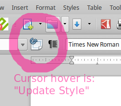 I've been having to do things like copy a whole document to change the font, that sort of thing. Now this addition to the toolbar is there asking me if I want to update style. (screenshot) I found this: https://help.libreoffice.org/Writer/...rom_Selections but I'm not really sure what it says and more than anything I don't want to screw anything up. Thanks. |