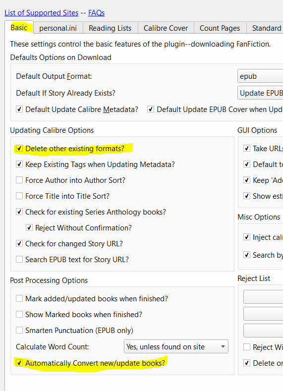 If you updated your epub version with FFF, but didn't re-convert it to azw3, Calibre is probably sending an out dated version to your device. FanFicFare has a couple options to help with that, one that deletes other ebook formats and one that automatically starts Calibre Convert on each downloaded/updated ebook: I use a Kindle and I keep both options turned on. For the auto-convert, you also need to the default Convert output format to azw3 in Calibre's Preferences. Hope that helps. |