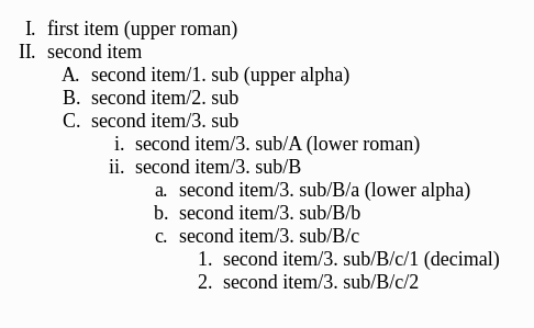 <style> ol {list-style-type: upper-roman;} ol ol {list-style-type: upper-alpha;} ol ol ol {list-style-type: lower-roman;} ol ol ol ol {list-style-type: lower-alpha;} ol ol ol ol ol {list-style-type: decimal;} ol ol ol ol ol ol {list-style-type: lower-alpha;} </style> Dale Last edited by DaleDe; 03-14-2017 at 07:10 PM.  |