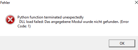 Python function terminated unexpectedly DLL load failed: The mentioned modul was not found (Error Code 1). Das angegebene Modul wurde nicht gefunden. I have W10, 64 bit. The extarnal Hard disc is a WD Element 10B8 USB Device, NTFS. Driver 10.0.14393.0 which is confirmed to be the latest version. The USB controller is built in the HP Laptop. Intel (R) USB 3.0 eXtensible - Hostcontroller- 1.0 Microsoft Driver: 10.0.14393.0 ( Same as WD HD??) If you need further information let me know. BR from Stollenkuh Toli |